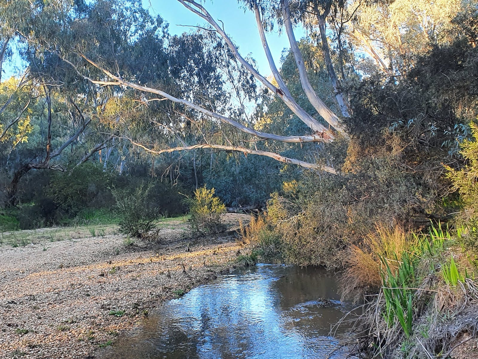 A fun family caravan park on a quiet creek in Victoria's North East — three generations of welcomes, fire pits on every site, and Victoria's smallest pub just up the road.
